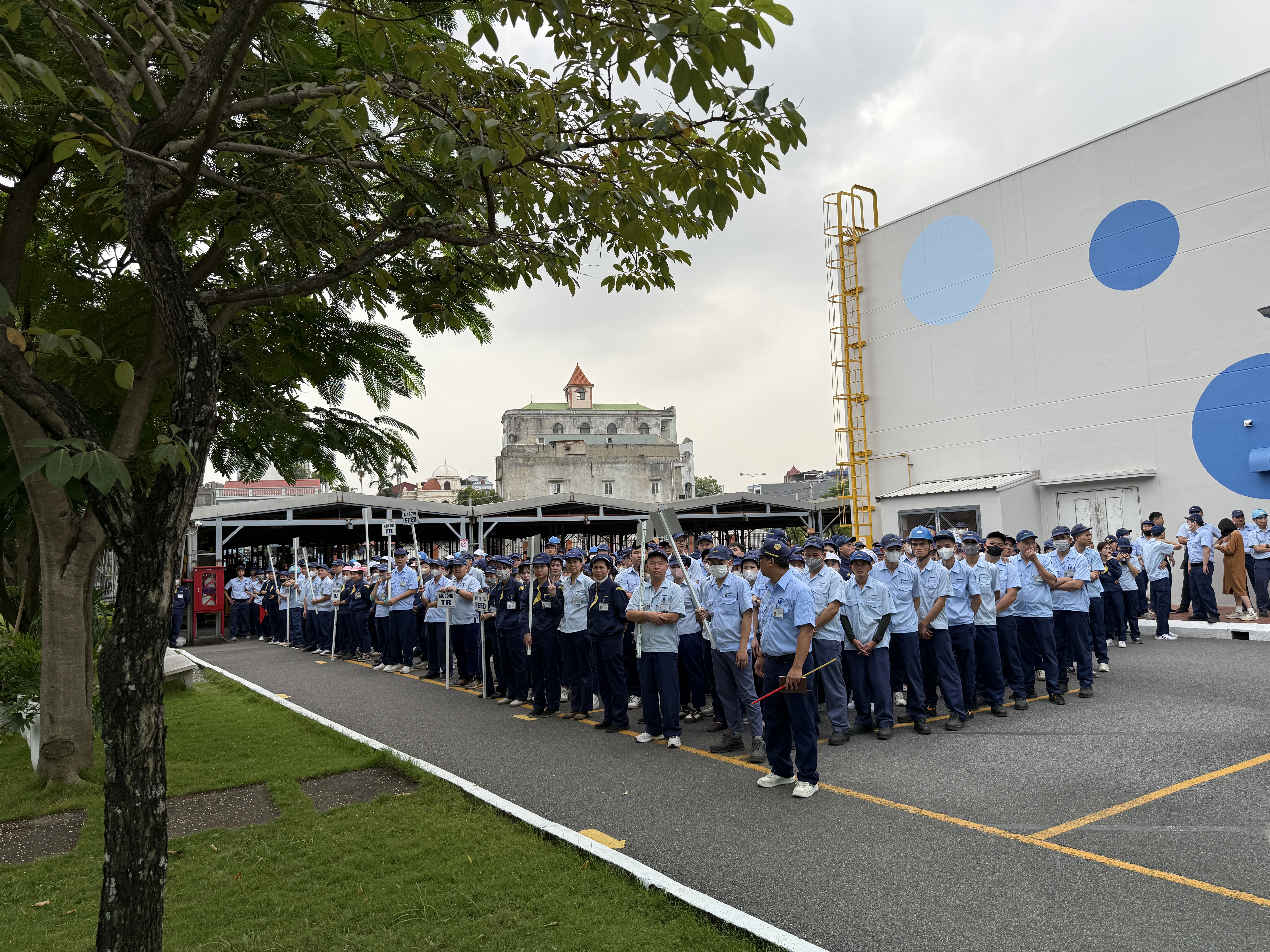 Buổi diễn tập diễn ra thành công tốt đẹp. Toàn bộ công nhân viên tham gia nghiêm túc, xếp hàng và điểm danh quân số theo từng bộ phận.